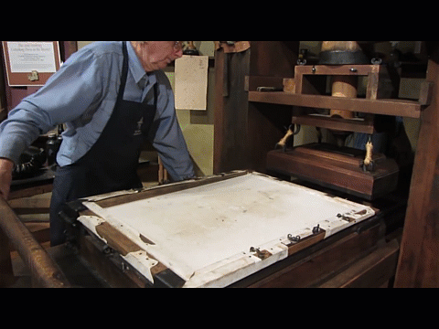 Placing a paper sheet on a wooden frame and sliding frame under a wooden press.